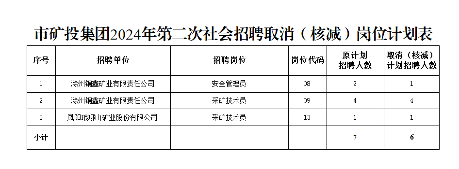根據(jù)《滁州市興滁礦業(yè)投資集團(tuán)有限公司2024年第二次社會(huì)招聘公告》規(guī)定,經(jīng)對(duì)各崗位報(bào)名情況篩查審定,結(jié)合資格復(fù)審情況,部分崗位報(bào)名情況未達(dá)到開(kāi)考比例,經(jīng)研究決定取消(核減)以下崗位招聘計(jì)劃: